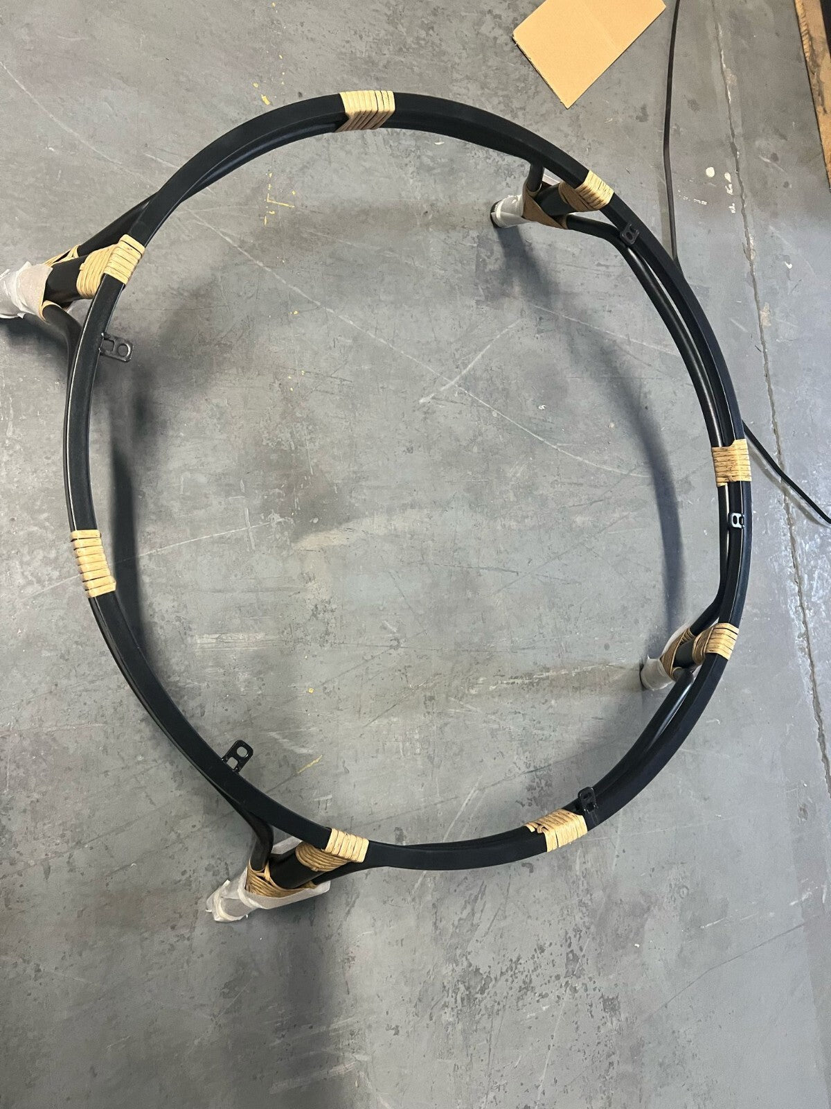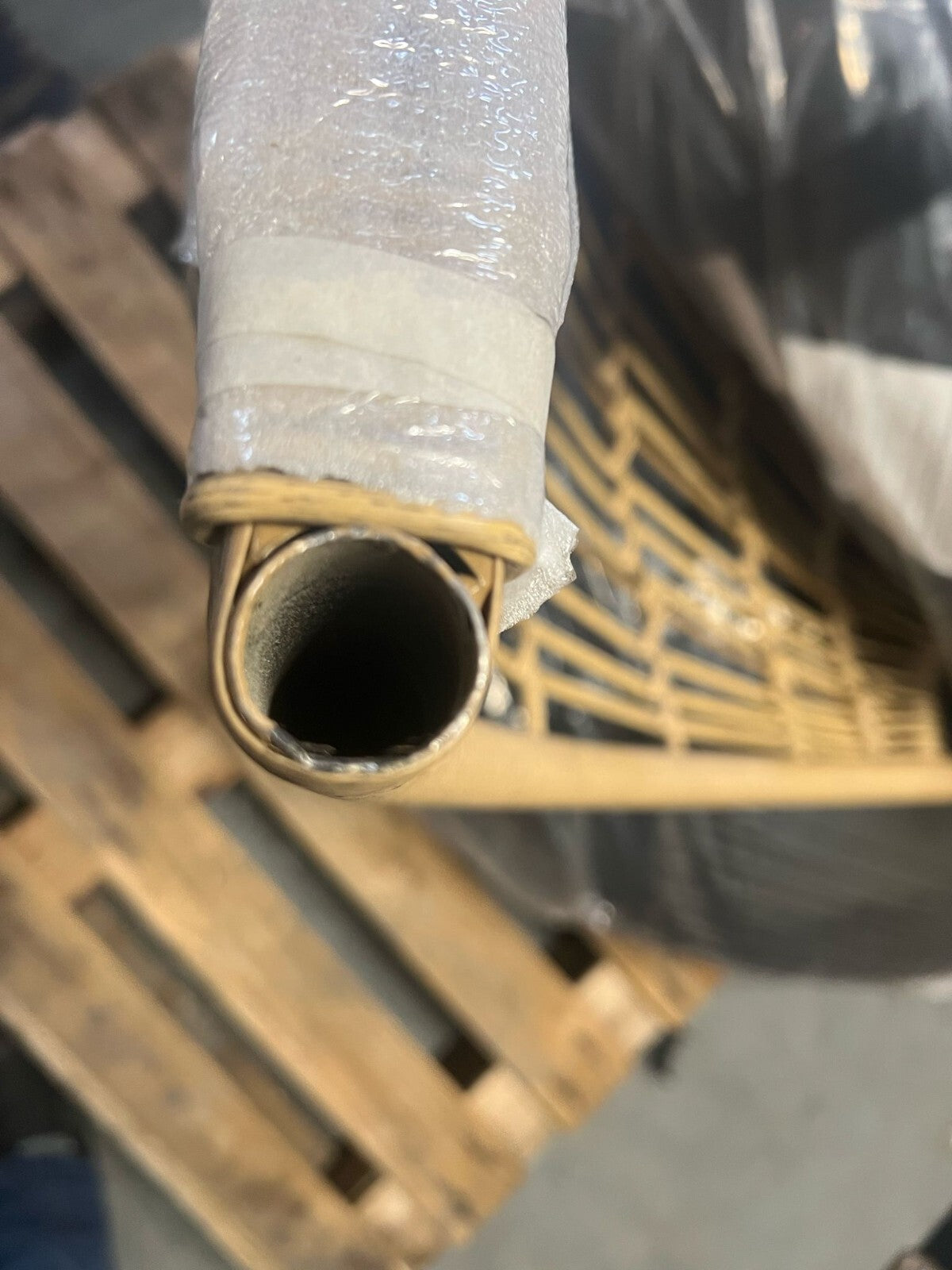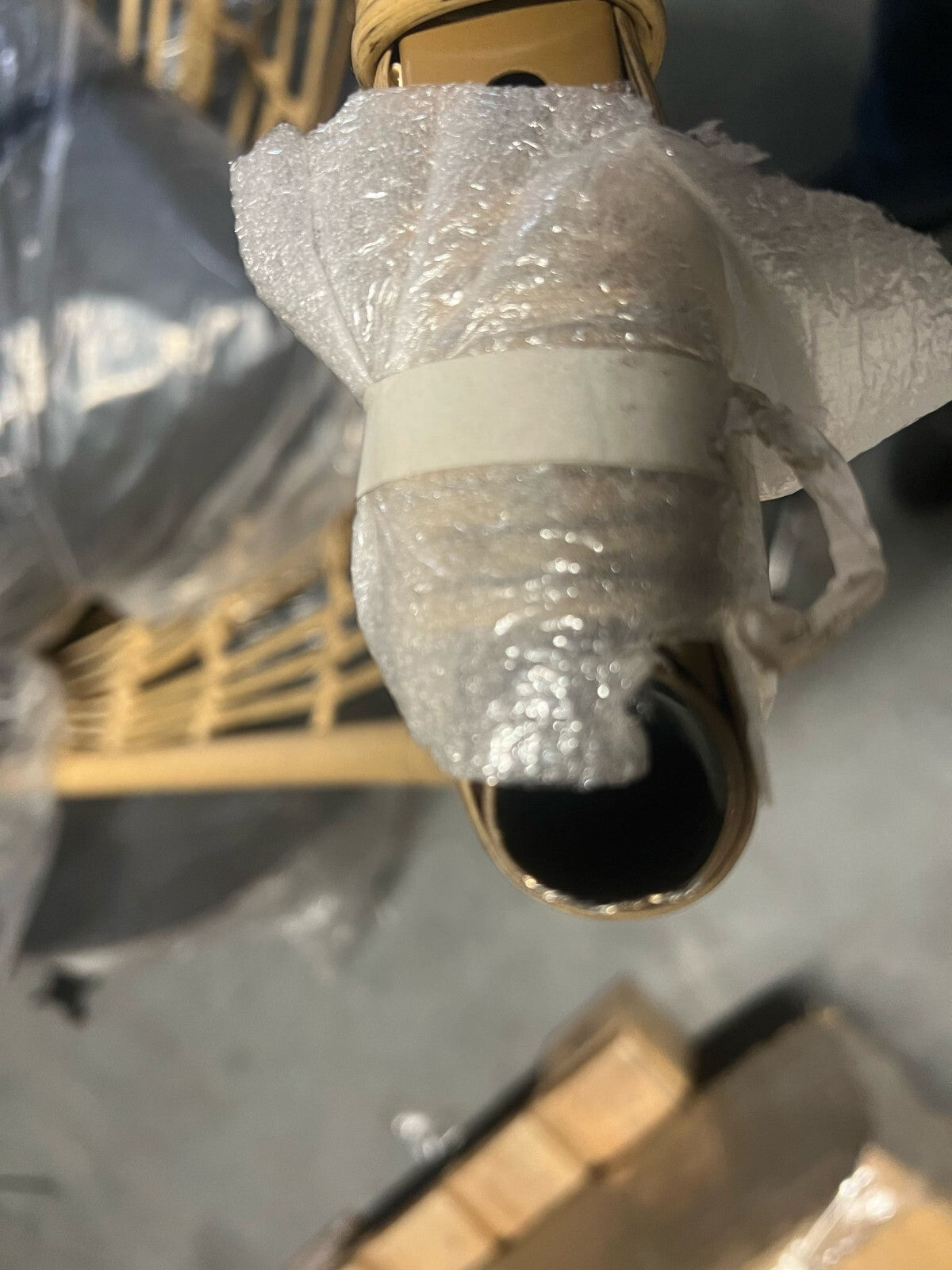 The item is new with no signs of use but may have some light scratches from inspection. There is a small dent on the connecting crossbar, as shown in the last images—please review all images carefully for details. The item comes with the user manual, cushions, and screws.